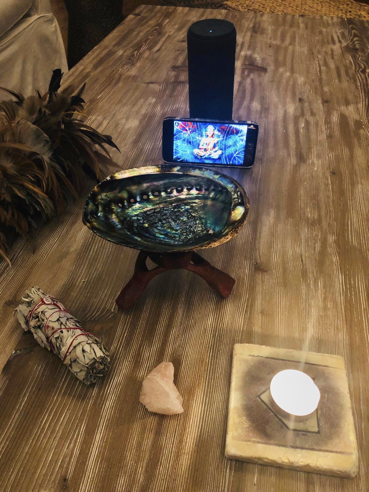 We will now set our intention for this week. I pass along a small piece of paper and pencil for each individual to write down their intention and then fold it up and place it in the abalone shell for burning. This process will seal our intentions and return the ashes to earth. I proceed to cleanse our auras and our dwelling which is sacred and protected now; rid of all negative energy and filled with only positivity.